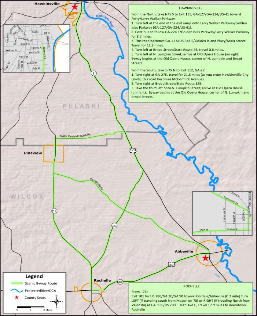 The Enduring Farmlands Scenic Byway showcases routes through the historic towns of Hawkinsville, Pineview, Rochelle,